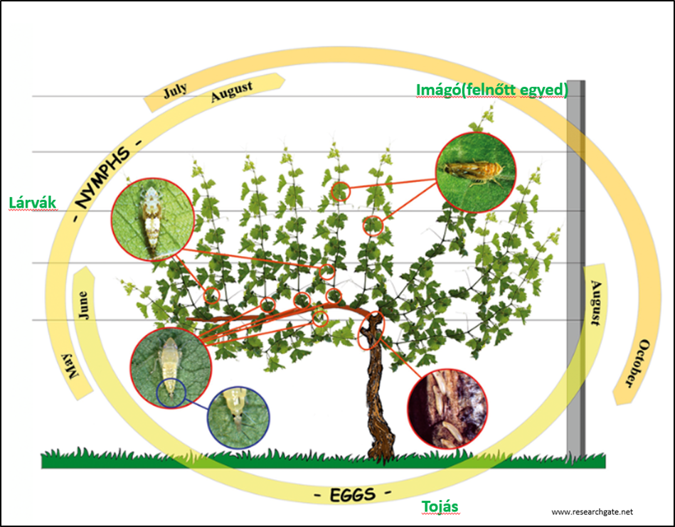 - a fertőzés terjesztőjével-átvivőjével, az amerikai szőlőkabócával (Scaphoideus titanus)